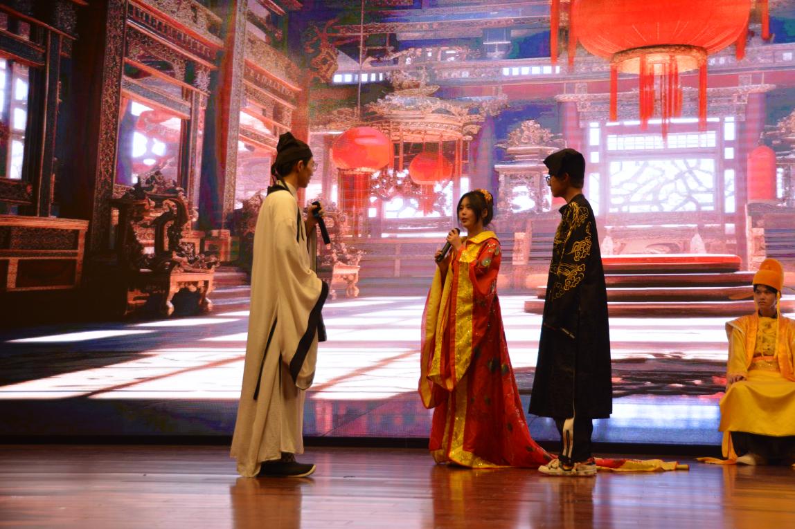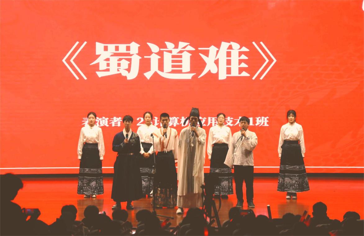 22印刷数字图文1班、23电气自动化2班等班级表演的名篇朗诵《将进酒》、《蜀道难》生动诠释出李白创作时的心情,也一步步让台下的观众融入国学经典的醇美之境,让无数“李白粉们”十足尽兴。