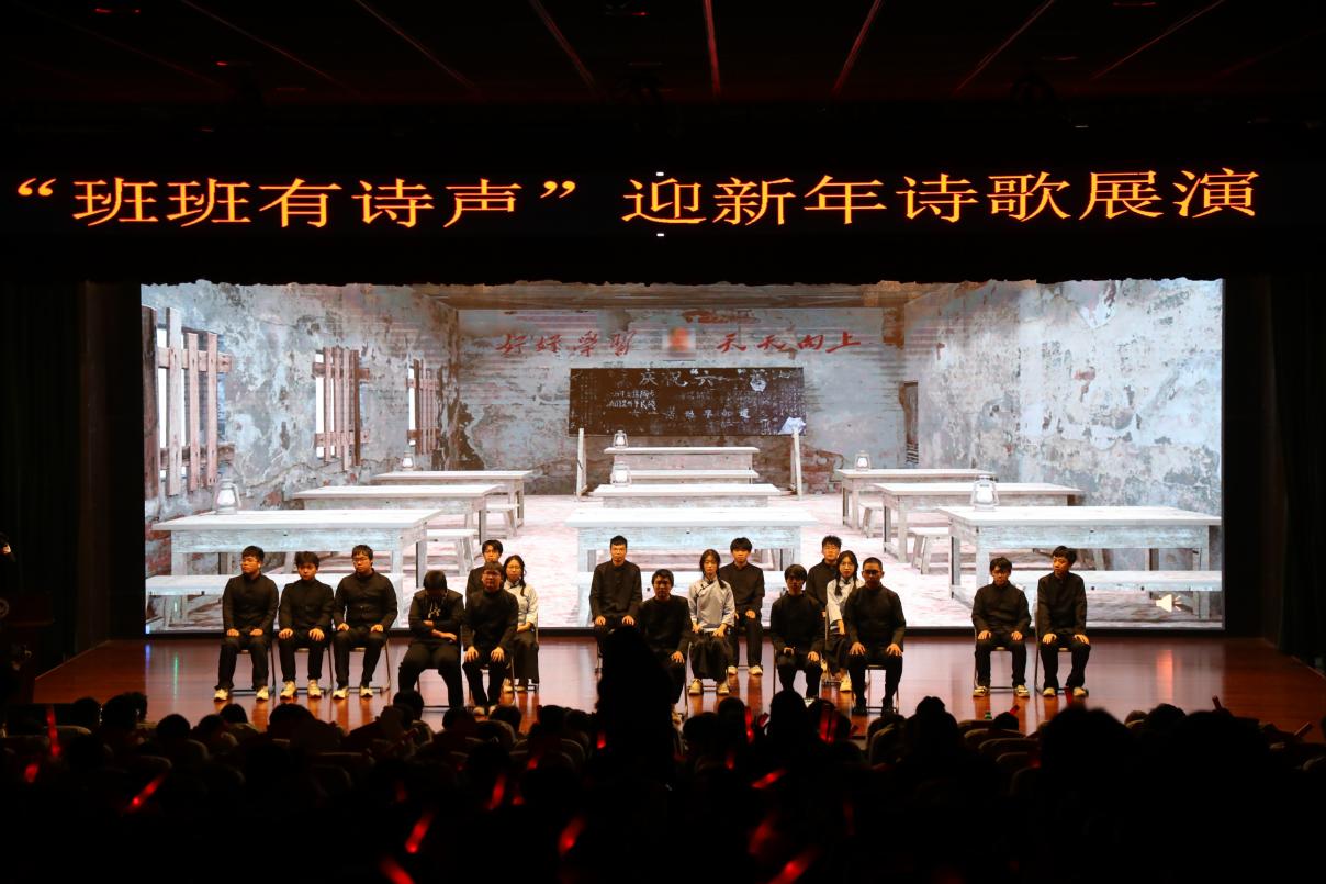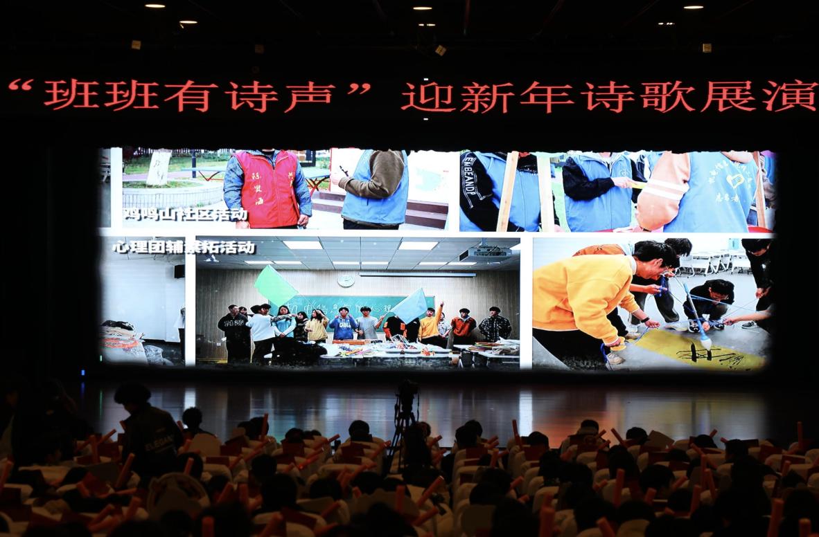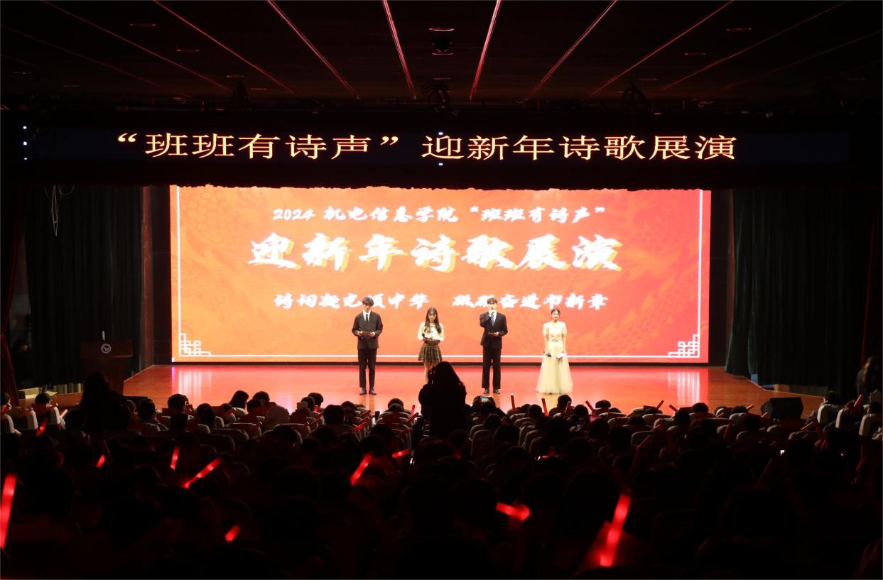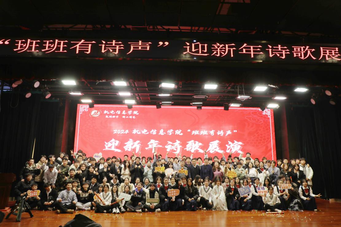 “班班有诗声”是机电信息学院精心打造的“红匠”文化品牌系列活动之一。自启动以来,已先后开展了“诗声琅琅”校园诵诗活动、“诗中真意”心得分享活动、“诗韵会友”围读交流活动、“诗书妙语”诗句摘抄书法比赛等活动,受到了同学们的喜爱。学院举行“班班有诗声”诗歌展演迎新年活动,旨在积极鼓励青年学子汇聚多种诗词元素,融合多种艺术形式,展现别样的青春风采,为学院师生带来了一场视觉和听觉的文化盛宴。