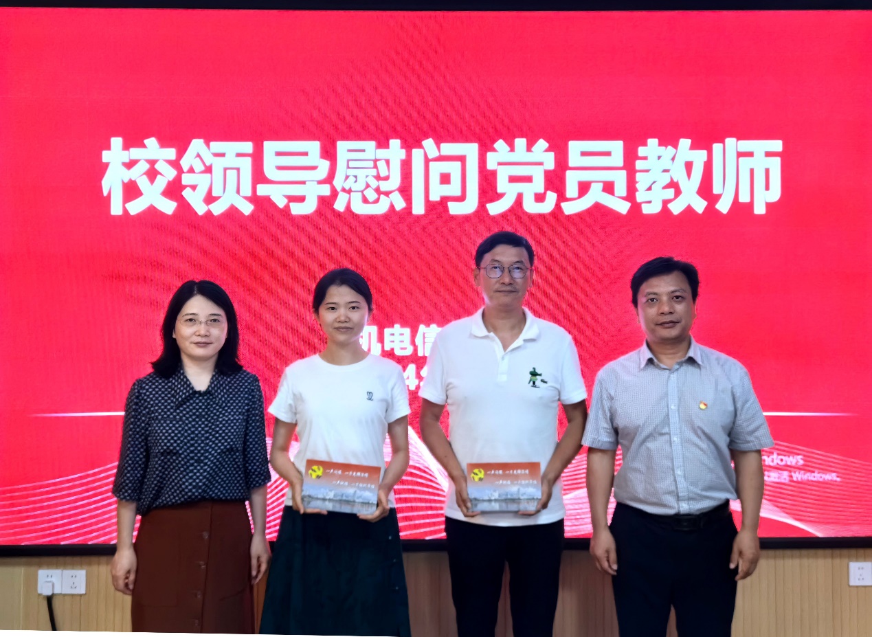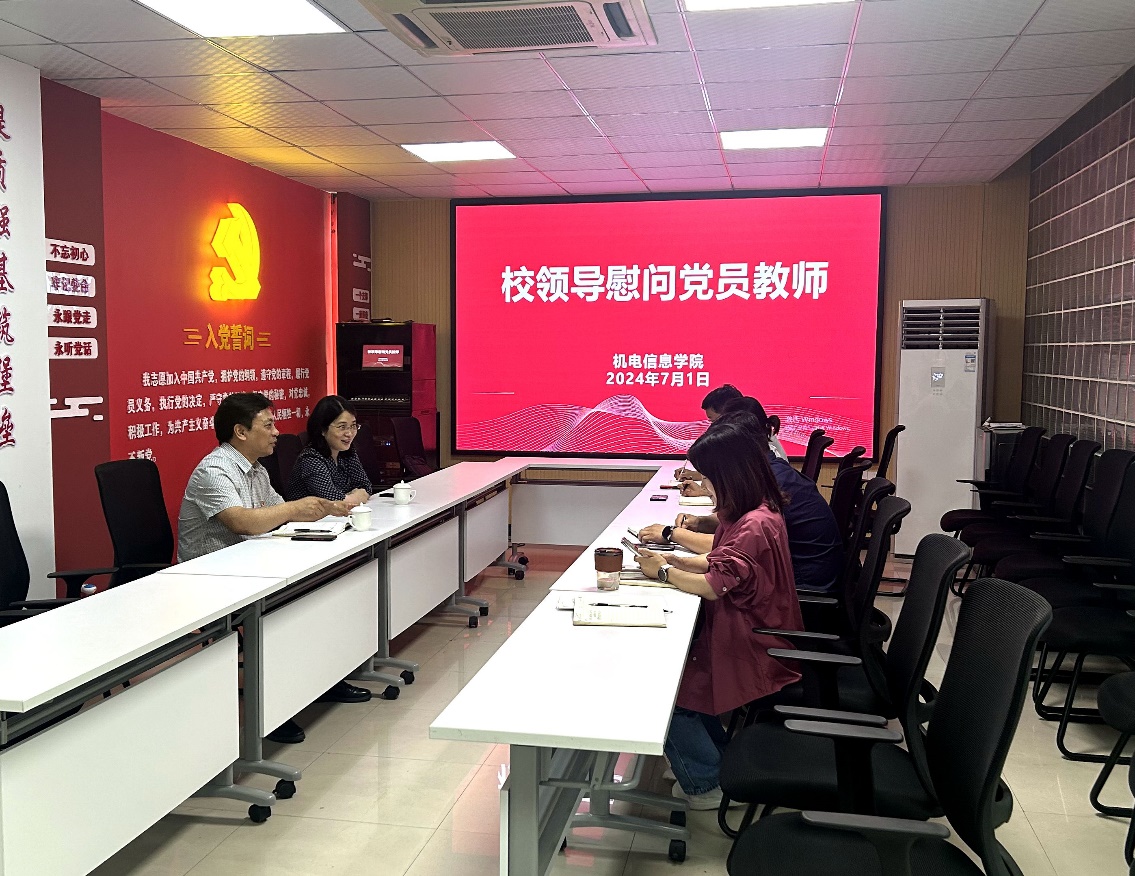 在庆祝中国共产党成立103周年之际,校党委副书记叶斯源、副院长盛湘君到机电信息学院慰问党员教师,调研指导学院工作。学院党政负责人、优秀党员教师李时辉、王柳参加活动。