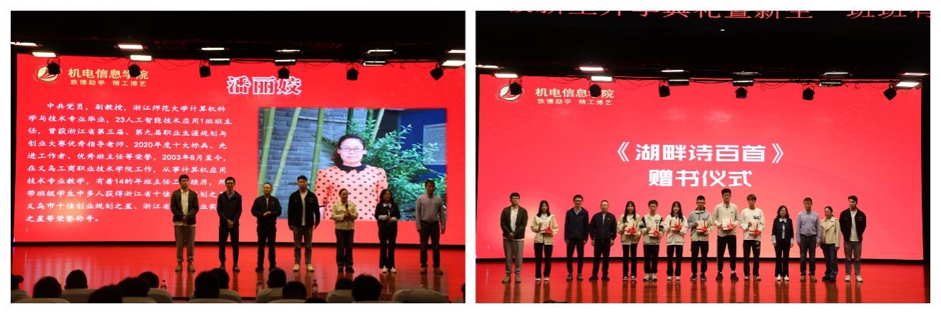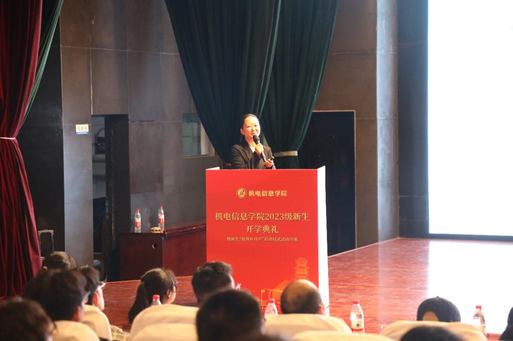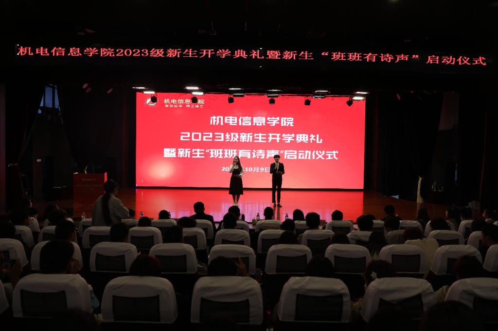 为切实做好学生思想政治工作,抓好学院典礼文化建设,上好新生大学“第一课”,10月9日下午,机电信息学院2023级新生开学典礼暨新生“班班有诗声”启动仪式在丹溪文化厅举行。学院大学生校外人生导师、全国五一劳动奖章获得者、浙江森宇有限公司研发项目处长史小娟,学院领导班子成员、专业主任、三办主任、新生班主任、全体辅导员、团委学生会学生干部、新生班助以及学院2023级全体新生参加。