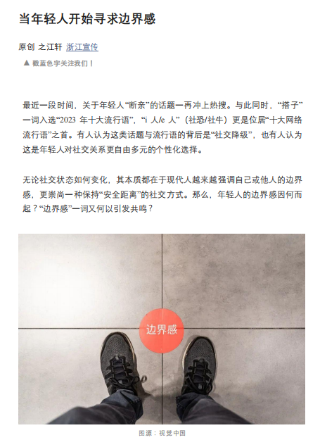 周润博士主要研究方向是无线通信网络,结合自己的研究方向,找准切入点,针对电子信息技术的发展与互联网的普及,促进了信息的快速传播,使得网络社交改变了人们的社交方式,同时通过持续关注、广泛阅读“浙江宣传”的文章发现,“浙江宣传”较多地关注年轻人关心的话题。他基于网络上关于年轻人“断亲”、“社交降级”等话题,“搭子” 、“i 人/e 人”(社恐/社牛)等网络流行语,对年轻人的社交-边界感展开了深入的研究,在浙师大-浙江省区域国别与国际传播研究智库专家的指导和义乌市委宣传部的大力支持下,反复修改、打磨,于2024年1月17日在浙江宣传发表了题为《当年轻人开始寻求边界感》一文,文章一经推出,就引起了广大网友热读,当日点击量超过10万+。