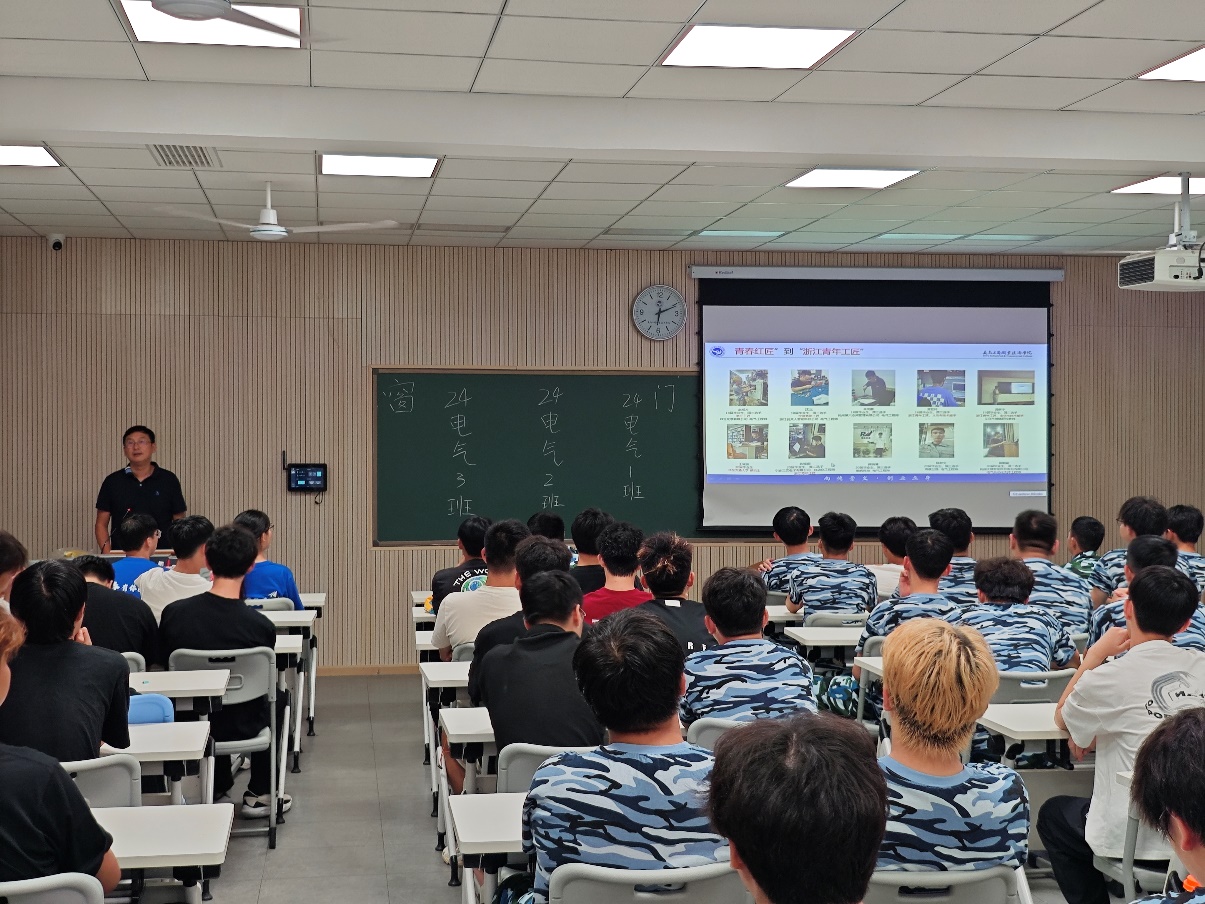 第二部分是专业技能工作室介绍,两位技能大师工作室负责人李时辉教授和楼京京教授分别从学习环境、日常活动、比赛要求等几个方面介绍了各自工作室。李老师还拿自己工作室优秀的毕业生作为例子,讲述了技能竞赛对学生综合能力提升的作用,以及学生毕业后逐步成长,由一名青春红匠成长为浙江工匠的事迹。楼老师也分享了另一位技能竞赛选手潜心技术钻研,获得技能竞赛国奖,后续成为浙江大学湖州研究院工程师的事迹。但是两位老师同时告诫学生,想加入工作室学习技能是辛苦且枯燥的,只有吃得了苦,耐得住寂寞才能掌握本领,才有机会在技能竞赛上有所收获。