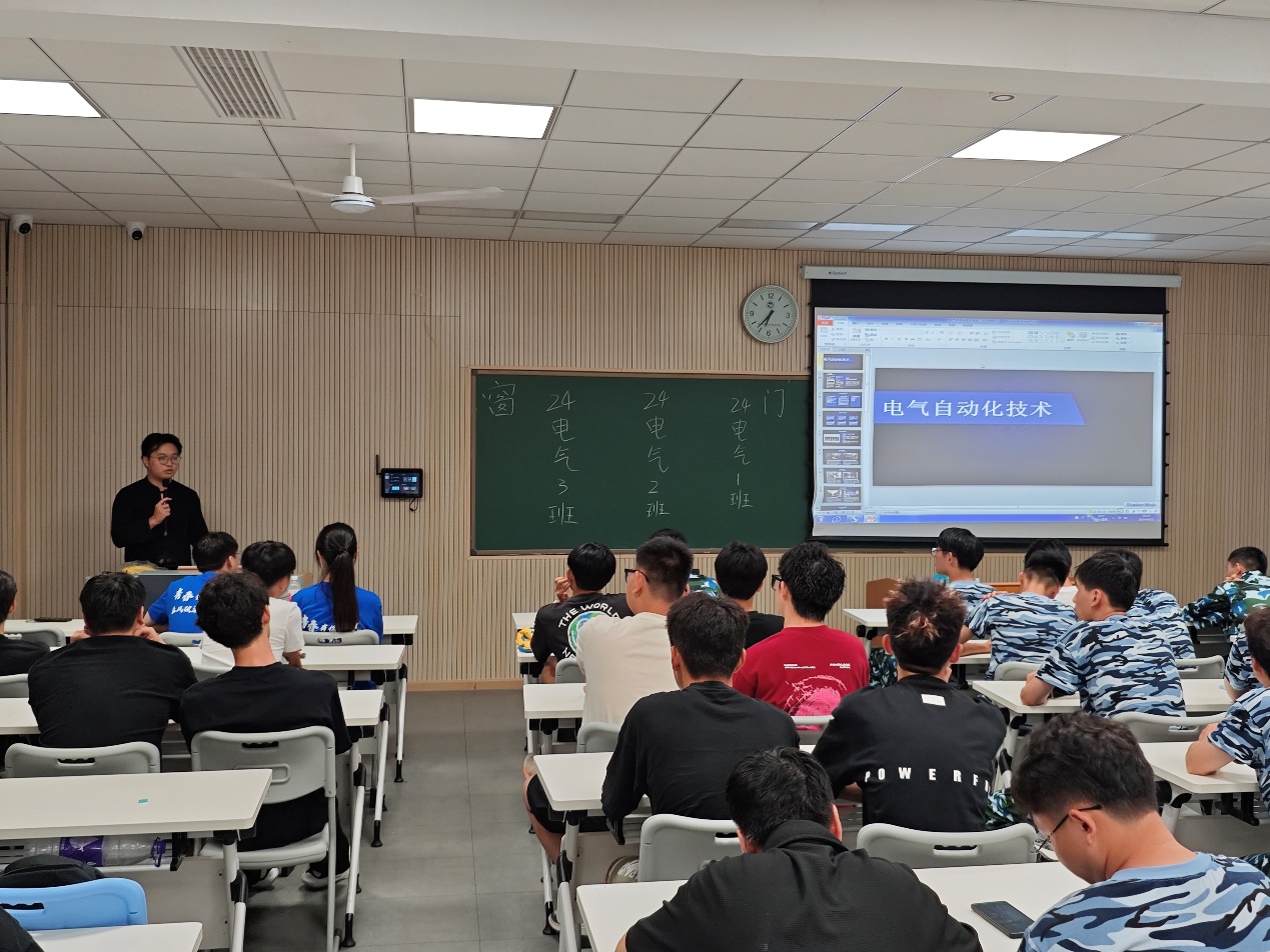 为了让新生更快了解专业情况,尽快适应大学生活,9月11日晚上,机电信息学院电气自动化技术专业机构在春晗楼301开展专业始业教育,活动主要分为三个部分,首先由专业主任丁浩介绍电气自动化技术专业情况,分别从专业发展历程、教学团队,学习目的、核心课程、毕业要求、就业方向和升学情况等几个方面展开介绍,鼓励新生们明确学习目标,合理规划时间,充分利用好三年宝贵的大学时光。