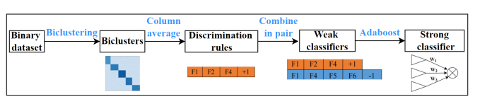 针对以上两个问题,周润博士首次关注开集气体识别问题,引入深度学习方法,提出了一种基于局部相似度的集成学习方法。该方法是挖掘列几乎不变的双聚类然后,采用MMSR(改进MSR)。修改平均列方差添加到原始MSR。双簇的挖掘包括两个部分:寻找相似点每个列中的集群,并扩展集群。最新研究成果在中国科学院3区上发表了,论文题目为《MGRBA: Gas Recognition With Biclustering and Adaboost》,由周润、王剑豪,黄康老师等共同参与完成。