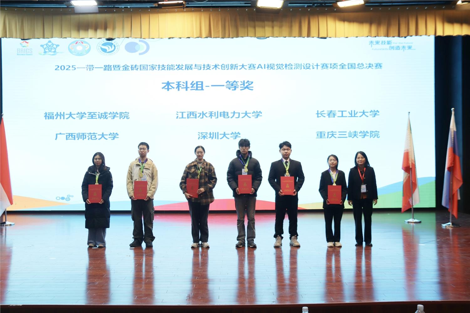 11月28日至30日,由金砖国家工商理事会中方理事会、一带一路暨金砖国家技能发展国际联盟、“一带一路”暨金砖国家技能发展与技术创新培训中心主办的2025一带一路暨金砖国家技能发展与技术创新大赛AI视觉检测设计赛项全国总决赛在我校顺利举行。金砖国家技能发展与技术创新大赛组委会执委会竞赛办公室(一处)处长朱宏书、副院长盛湘君等嘉宾出席闭幕式并颁奖。