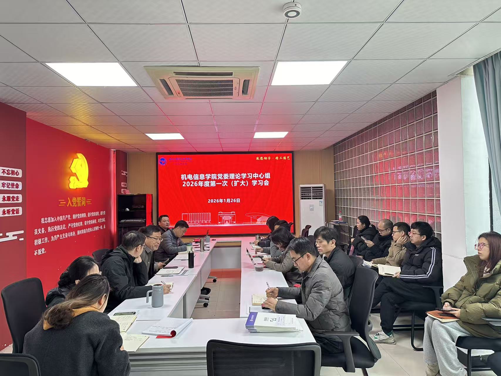 1月26日上午,机电信息学院党委理论学习中心组举行2026年第一次学习会,传达学习习近平总书记在中共中央政治局召开民主生活会上发表的重要讲话精神,研究部署推进落实工作。学院领导班子成员、专业主任、党支部书记、办公室、教科办、学工办、团委、继教部负责人,纪委委员、组织员,全体行政人员参加会议。